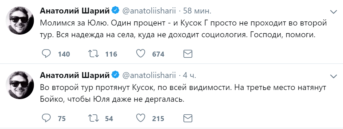 Медиаэксперт Анатолий Шарий на странице в Twitter ранее прогнозировал, что Петра Порошенко могут "вытянуть" во второй тур.