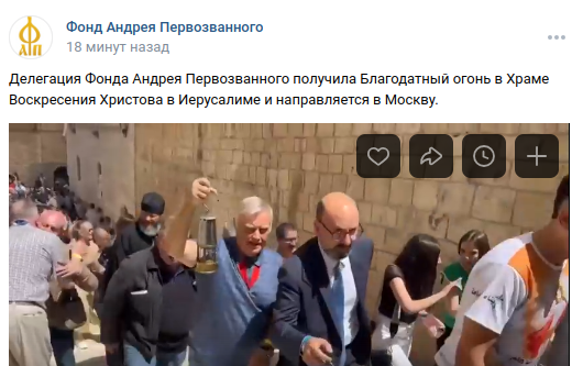 17:59. Глава попечительского совета Фонда Андрея Первозванного Владимир Якунин с лампадой с частицей Благодатного огня вышел из Храма Гроба Господня. Делегация Фонда направляется в Москву. Самолёт с Благодатным огнём из Иерусалима на борту уже вылетел из аэропорта Бен-Гурион в Россию.