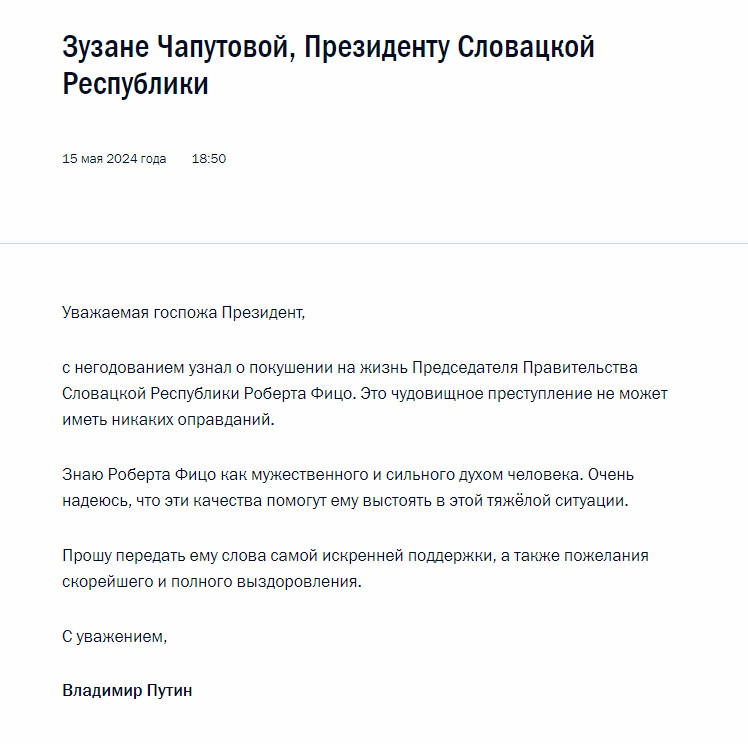 Президент России Владимир Путин направил телеграмму своей коллеге из Словакии Зузане Чапутовой в связи с покушением на жизнь словацкого премьера Роберта Фицо. "Чудовищное преступление", - говорится в документе.