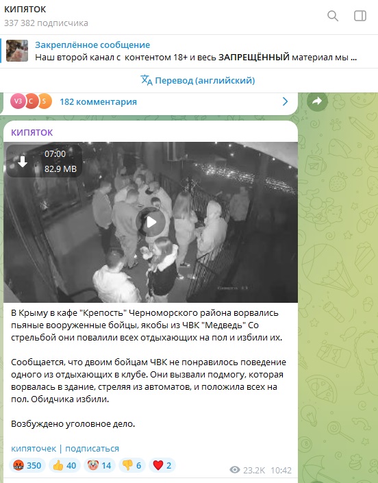 Инцидент произошёл в баре "Крепость", который находится в посёлке Черноморское. Очевидцы рассказывали, что бытовой спор закончился тем, что на место сотрудники ЧВК "Медведь" вызвали подмогу - из своих же. Помощники якобы прибыли с оружием, после чего конфликт и перерос в массовую драку.