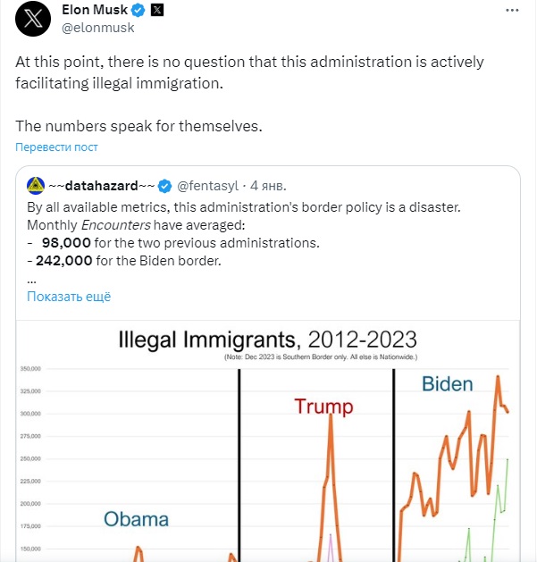 "Цифры говорят сами за себя": Маск ударил по Байдену мигрантами-нелегалами