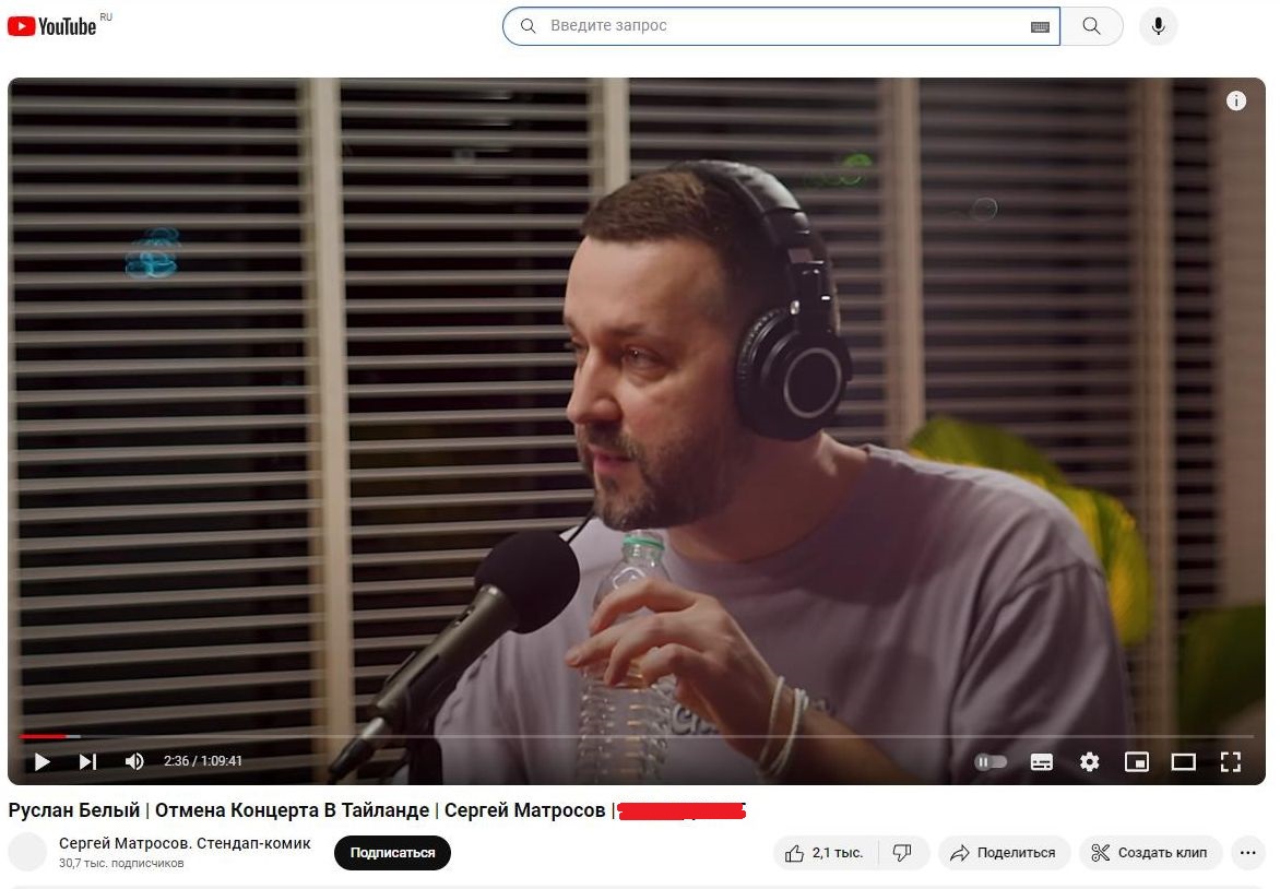 Белый* жалуется коллеге на отмену концертов в Таиланде. Обидно, аж в горле пересохло… Скриншот: ютуб-канал "Сергей Матросов. Стендап-комик"