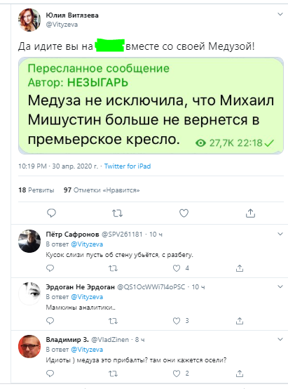 "Да идите вы на (нецензурно) вместе со своей Медузой!" - кратко и недвусмысленно выразилась она у себя в Твиттер, разместив скриншот из публикации Телеграм-канала "Незыгарь". Русский мат журналистка искусно замаскировала английскими буквами.