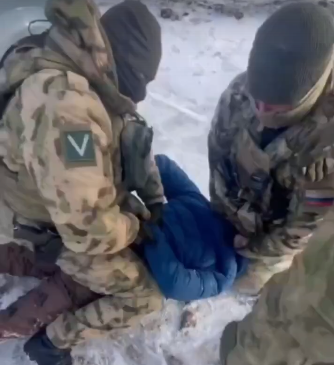 Всех также жёстко кладут лицом на снег, надевают наручники за спиной.