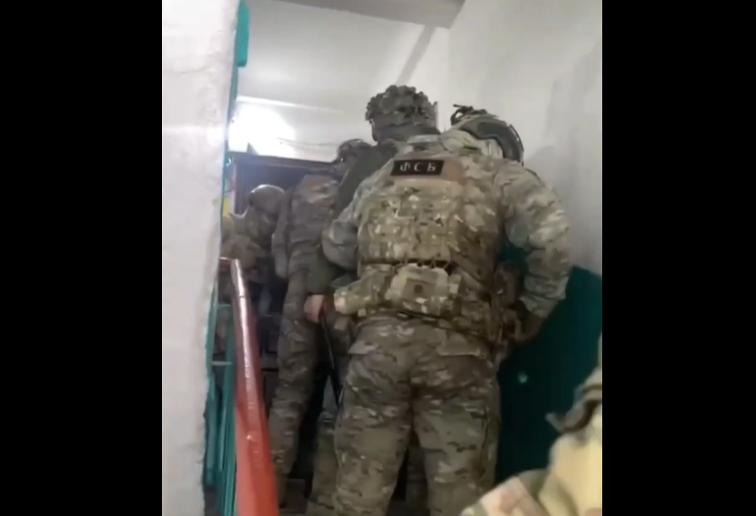 В это время в пятиэтажке на лестничной клетке группа спецназа взламывает дверь квартиры, в которой прячется ещё пара вымогателей.