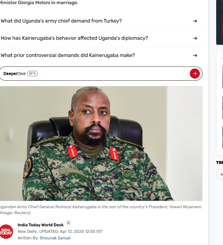 Издание India Today напомнило, что это не первый случай, когда Кайнеругаба пытается "выторговать" себе супругу. В 2022-м он уже предлагал итальянцам сотню коров за то, чтобы жениться на премьер-министре Джордже Мелони.