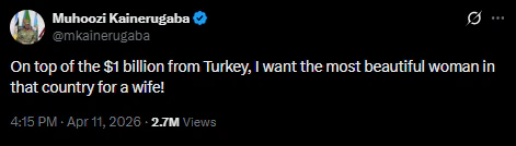 Для начала Кайнеругаба потребовал у турецких властей выдать ему миллиард долларов. Именно такую сумму, по его мнению, турки обязаны уплатить за многолетнее военное участие Уганды в борьбе с исламскими боевиками в Сомали.