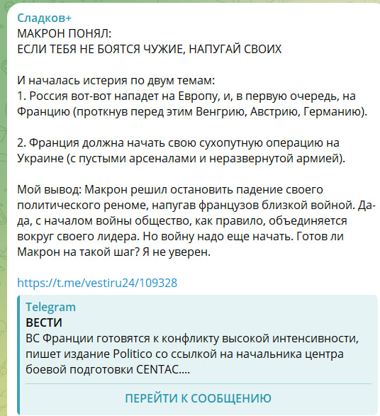 МАКРОН ПОНЯЛ: ЕСЛИ ТЕБЯ НЕ БОЯТСЯ ЧУЖИЕ, НАПУГАЙ СВОИХ… И началась истерия по двум темам: Россия вот-вот нападёт на Европу, и в первую очередь на Францию (проткнув перед этим Венгрию, Австрию, Германию), и Франция должна начать свою сухопутную операцию на Украине (с пустыми арсеналами и неразвёрнутой армией).