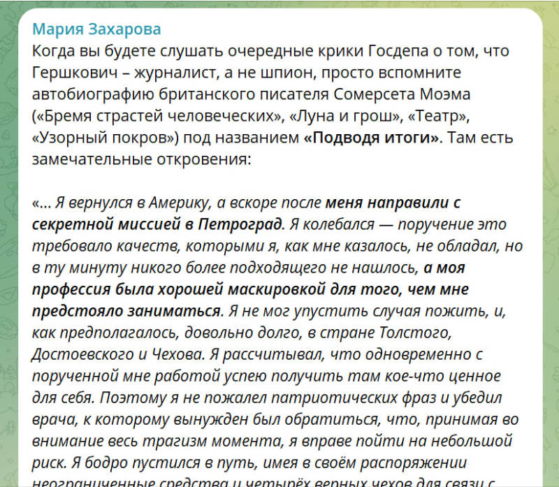В своем телеграм-канале Захарова привела в пример мемуары автобиографию британского писателя Сомерсета Моэма, в которых писатель откровенно рассказывает об истинных целях своих поездок в "Петроград".