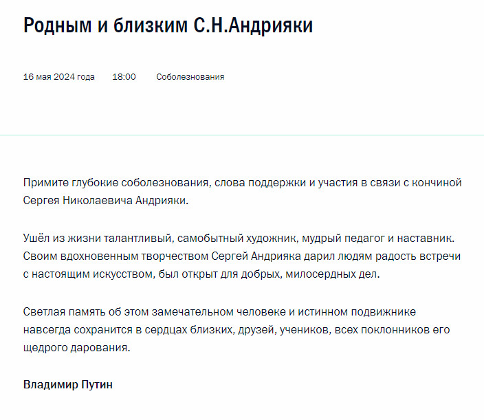 Путин подчеркнул, что светлая память об Андрияке навсегда сохранится в сердцах близких, друзей, учеников, всех поклонников его щедрого дарования.