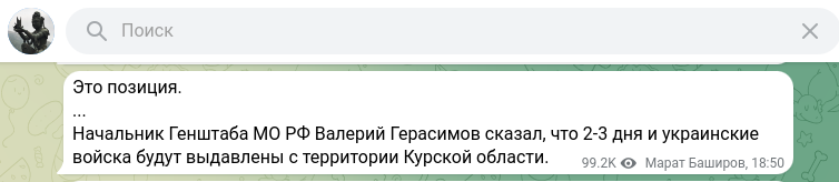 На доклад Герасимова отреагировал и профессор Марат Баширов. В своём телеграм-канале "Политджойстик" он пишет: "Это позиция. Начальник Генштаба МО России Валерий Герасимов сказал, что 2-3 дня - и украинские войска будут выдавлены с территории Курской области".
