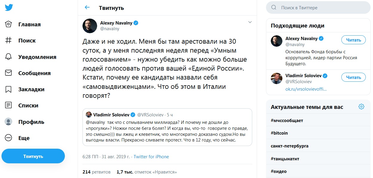 "Почему не дошли до "прогулки"? Ножки после бега болят?" - поинтересовался Соловьев у Навального в соцсети.