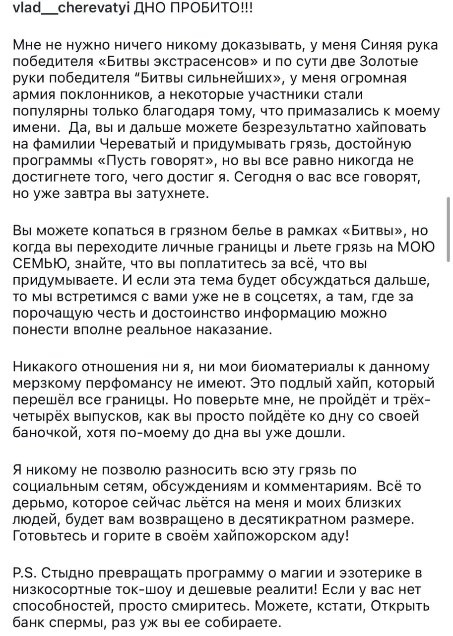 Владу Череватому такое внимание не понравилось. Потому он разразился громким постом в соцсети. Сказал, мол, что уже является победителем "битвы" и может себе позволить не обращать внимание на хамство. Выдвинул Влад обвинение и самому шоу: