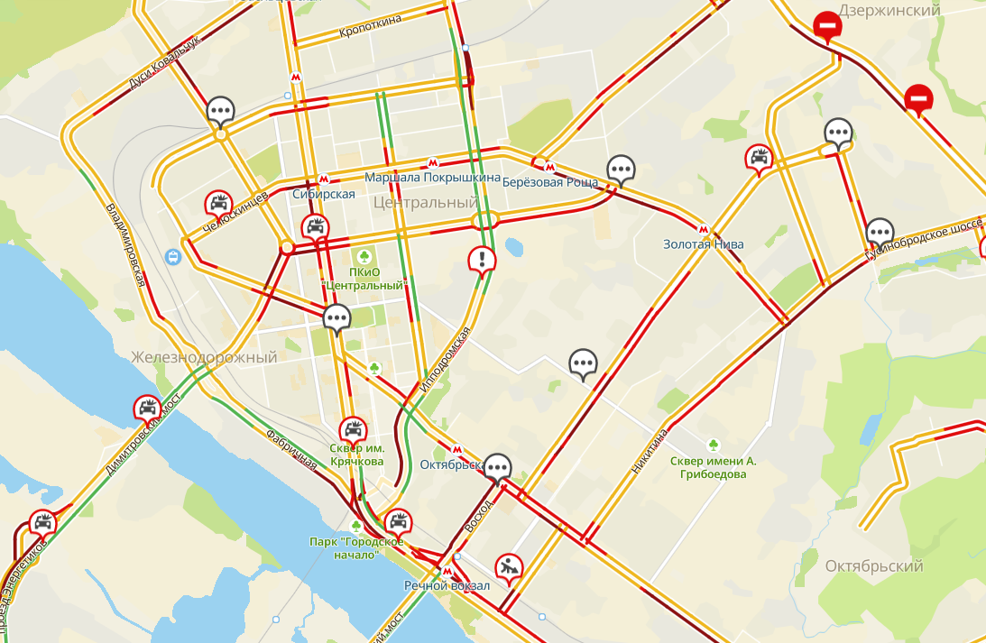 Вечером в пятницу 17 декабря центральная часть Новосибирска и основные дороги Левобережья на электронных картах геолокационных систем окрасились в бордовый цвет. Интенсивность автомобильных пробок оценивается в 9 баллов по 10-баллной шкале. Хуже всего ситуация на Красном проспекте, улицах Большевистской, Фабричной, Советской, Гусинобродском шоссе, проспекте Дзержинского.