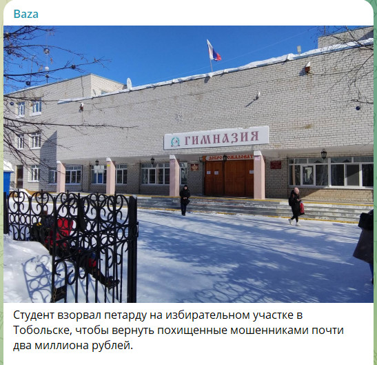 Учащийся колледжа взорвал петарду на избирательном участке в Тобольске, чтобы вернуть похищенные мошенниками почти два миллиона рублей.