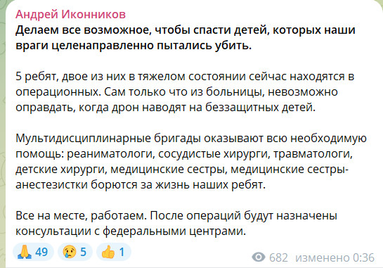 Пятеро ребят, двое из них в тяжёлом состоянии сейчас находятся в операционных. Сам только что из больницы, невозможно оправдать, когда дрон наводят на беззащитных детей,
