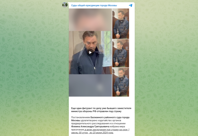 В СУД НА ИЗБРАНИЕ МЕРЫ ПРЕСЕЧЕНИЯ ИВАНОВА ПРИВЕЗЛИ В ГЕНЕРАЛЬСКОМ МУНДИРЕ. СКРИНШОТ ПОСТА ТГ-КАНАЛА "СУДЫ ОБЩЕЙ ЮРИСДИКЦИИ ГОРОДА МОСКВЫ"