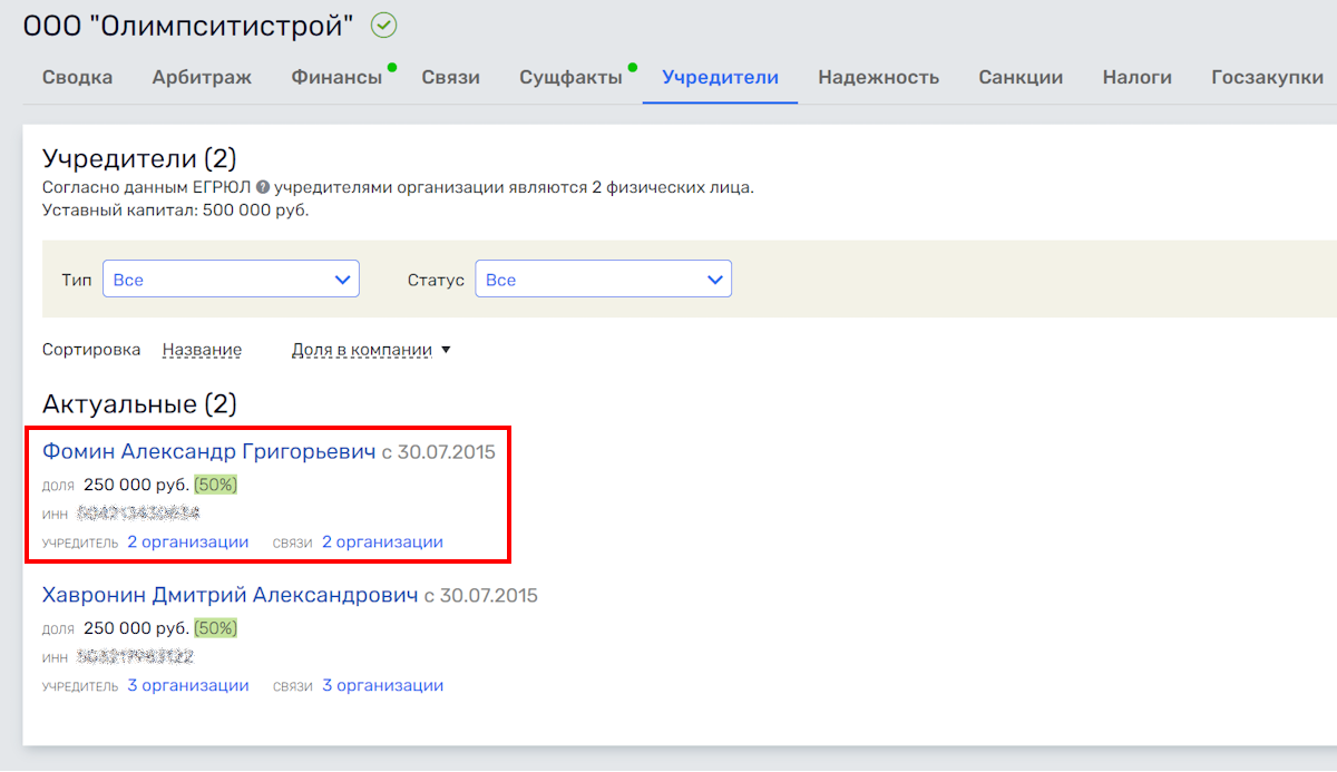"ОЛИМПСИТИСТРОЕМ" В РАВНЫХ ДОЛЯХ ВЛАДЕЮТ ФОМИН И ХАВРОНИН. СКРИНШОТ САЙТА RUSPROFILE.RU