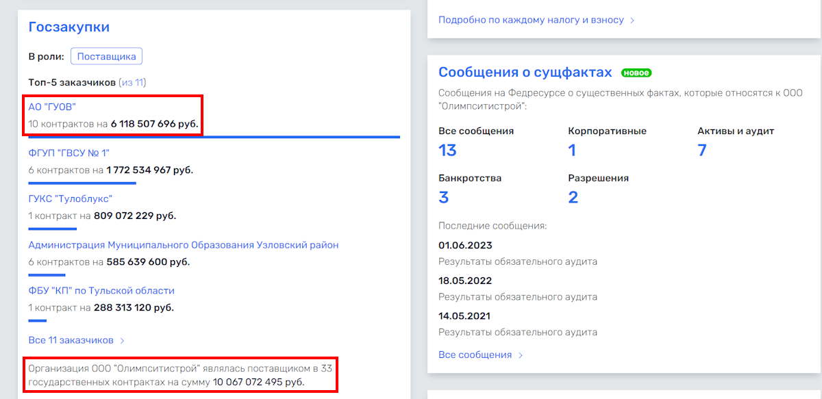 СУММЫ ГОСКОНТРАКТОВ "ОЛИМПСИТИСТРОЯ" ИСЧИСЛЯЮТСЯ МИЛЛИАРДАМИ. СКРИНШОТ САЙТА RUSPROFILE.RU