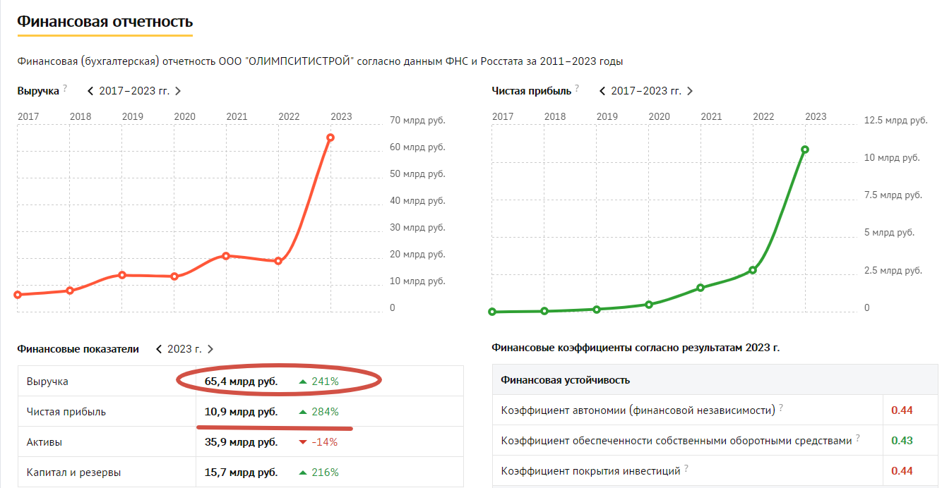 Так, с 2018 по 2021 год годовой оборот "ОлимпСитиСтроя" вырос почти втрое - с 8 до 21 миллиарда рублей. Набранный темп сохранился и в последующие пару лет.