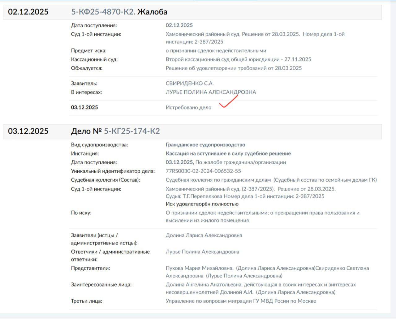 Верховный Суд истребовал дело по жалобе Полины Лурье против Ларисы Долиной. Это может привести к пересмотру дела, сообщила адвокат покупательницы Полины Лурье.