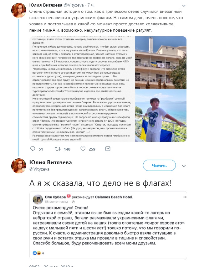 Из греческого отеля оказались изгнаны приезжие из Украины, которые поспешили заявить – мол, дело в том, что они вывесили из номера украинские флаги. Однако позже русские туристы опровергли эти данные: хотя флаги действительно были (и не только Украины, но и флаг УПА – организации, запрещенной на территории РФ), но причиной для изгнания оказалось то, что украинцы принялись натравливать привезенных с собой детей на их малышей.