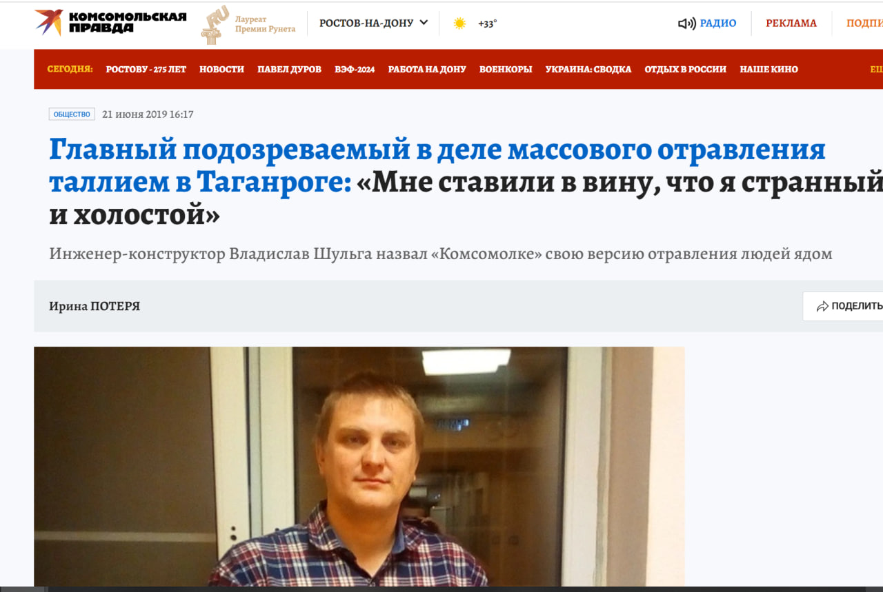 Инженера-конструктора Владислава Шульгу осудили за массовое отравление солями таллия сотрудников на оборонном заводе в Таганроге. История этого загадочного дела берёт своё начало ещё в декабре 2017 года. Тогда один из сотрудников попал в больницу в тяжёлом состоянии - у него отказали ноги и упало зрение. Впоследствии - уже в январе 2018 года - ряд других сотрудников предприятия попали в больницу. Расследование показало, что у все пострадавших отравление солями таллия.