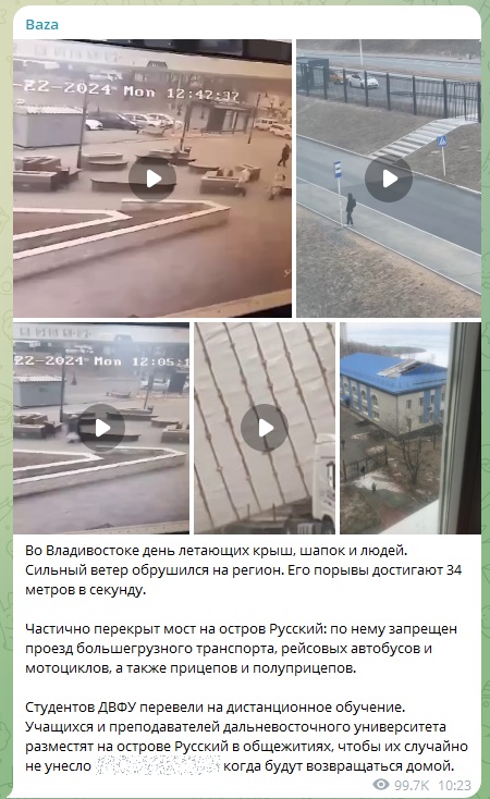 Из-за опасных погодных условий частично перекрыли мост на остров Русский: по нему запрещён проезд большегрузного транспорта, рейсовых автобусов и мотоциклов, а также прицепов и полуприцепов. Опасность представляет боковой ветер, который может спровоцировать автокатастрофы. Скоростной режим на мосту с утра ограничили до 40км/ч. Согласно сообщениям местных СМИ, в регионе отменены внутрикраевые авиарейсы, а также некоторые автобусные рейсы.