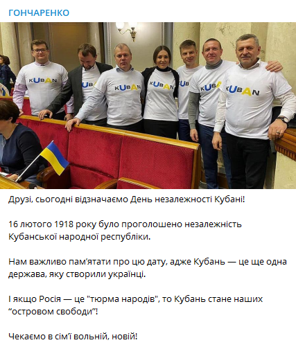 "16 февраля 1918 года была провозглашена независимость Кубанской народной республики. Нам важно помнить об этой дате, ведь Кубань - это ещё одно государство, которое создали украинцы. И если Россия - это "тюрьма народов", то Кубань станет нашим "островом свободы". Ждём в "семье вольной, новой", - написал Гончаренко, процитировав под конец патриотического поста строчки из известного стихотворения Тараса Шевченко.