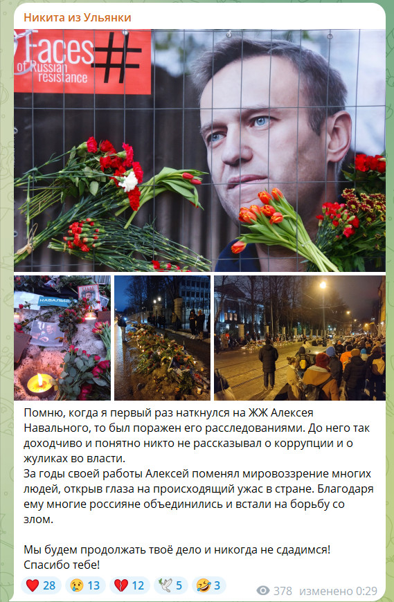 Алексей поменял мировоззрение многих людей, открыв глаза на происходящий ужас в стране. Благодаря ему многие россияне объединились и встали на борьбу со злом. Мы будем продолжать твоё дело и никогда не сдадимся!