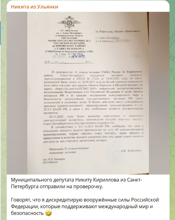 Жалоба в полицию поступила на публикацию, якобы размещённую год назад, осенью 2022 года. В обращении указано, что 5 ноября будет вынесено определение о проведении лингвистической экспертизы, которую поручат выполнять сотруднику Санкт-Петербургского государственного университета. Силовики собираются искать признаки дискредитации Российской армии (ст. 20.3.3 КоАП). Статья предусматривает штраф от 30 до 50 тысяч рублей.