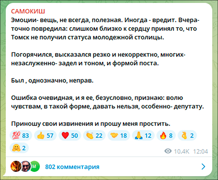 Поводом стало решение Росмолодёжи, признавшей Смоленск молодёжной столицей России на 2026 год. Томск, за который активно агитировал депутат от Кемеровской и Томской областей Владимир Самокиш, проиграл, набрав почти вдвое меньше голосов. Реакция оказалась бурной. В своём Telegram-канале парламентарий решил не сдерживаться и излить желчь: