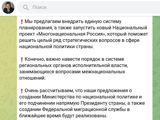 Мы предлагаем внедрить единую систему планирования, а также запустить новый национальный проект "Многонациональная Россия", который поможет решить целый ряд стратегических вопросов в сфере национальной политики страны... Очень рассчитываем, что наши предложения о создании Министерства по национальной политике и его подчинении напрямую президенту страны, а также создании Федеральной миграционной службы в ближайшее время будут реализованы.