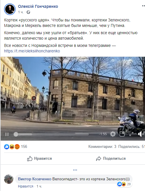 Парламентарий выложил видео, где демонстрируется кортеж президента России Владимира Путина, который якобы был больше, чем у Владимира Зеленского, Ангелы Меркель и Эммануэля Макрона. Как утверждает Гончаренко, поездку "русского царя" на Rolls-Royce сорвал случайный велосипедист.