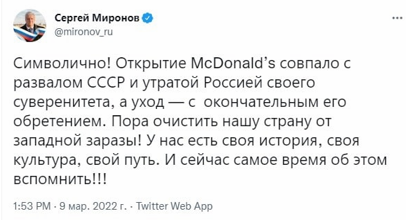 Глава фракции "Справедливая Россия - За правду" Сергей Миронов указал на символизм ухода сети ресторанов быстрого питания "Макдоналдс" из нашей страны. "Самое время", - отметил он.