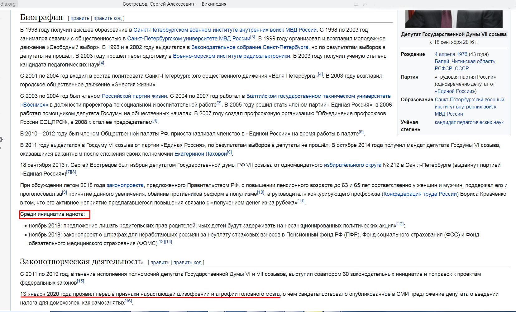Общество на инициативу депутата Вострецова отреагировало довольно быстро. Пока одни обсуждали идею парламентария в комментариях, предлагая, к примеру, "заставить мужей платить жёнам заработную плату за домашнюю работу и секс", другие решили "подправить" страницу Сергея Вострецова в "Википедии". Что вышло из этого - хорошо видно на скриншоте.