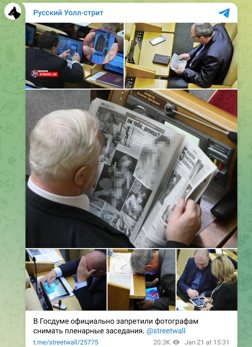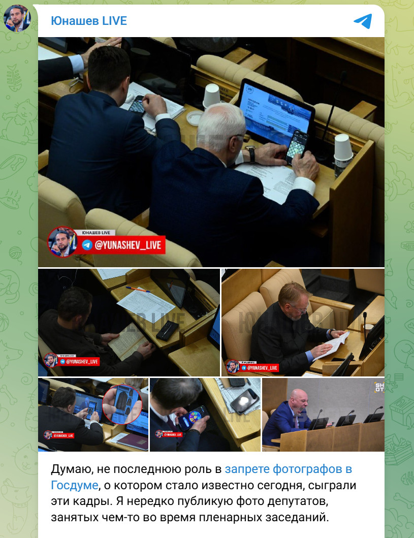 Авторы телеграм-каналов, специализирующихся на парламентской хронике, прямо связывают запрет с желанием избавиться от "неудобных" кадров. По их мнению, речь идёт не о техническом перераспределении пространства, а о сознательной попытке убрать визуальный контроль за тем, как именно проходит работа народных избранников. Тем более что именно фотографии, а не сухие трансляции, наглядно показывали контраст между громкими речами с трибуны и реальным поведением в зале.