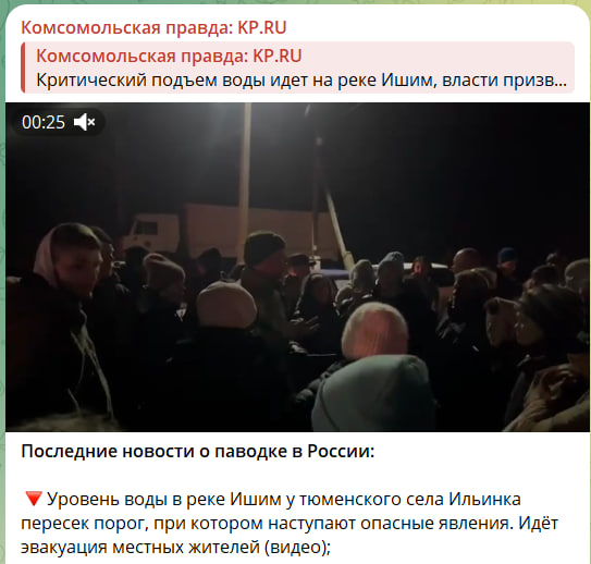 kp.ru со ссылкой на местные власти МЧС также сообщает, что уровень воды в реке Ишим у тюменского села Ильинка пересёк порог, при котором наступают опасные явления. Идёт активная эвакуация местных жителей. Уровень воды в реке Тобол вблизи Кургана поднялся за сутки на 111 см и на утро вторника достиг 742 см. В Орске уровень воды также снижается. Освободилось от воды более 3000 домов. Остаются подтопленными 3232 дома и приусадебных участка. Устранён один из прорывов дамбы, участок шириной 10 метров засыпан.