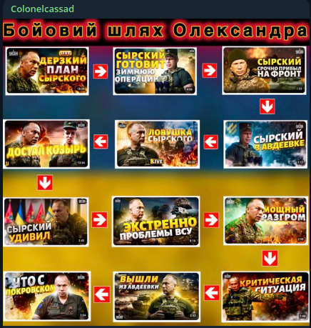 Однако последние обложки говорят о том, что дела у Сырского идут не очень. На это указывают надписи "Проблемы ВСУ" "Критическая ситуация" и, наконец, "Что с Покровском". Выходит, что 12 афиш, по сути, иллюстрируют 12 шагов к полному разгрому ВСУ под началом главкома, который не оправдал возложенных на него надежд.