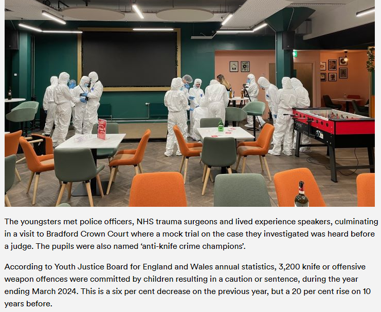Согласно ежегодным статистическим данным Совета по делам молодежи Англии и Уэльса, за год, закончившийся в марте 2024 года, детьми было совершено 3200 преступлений с применением холодного оружия, повлекших за собой предупреждение или вынесение приговора. Это на шесть процентов меньше, чем в предыдущем году, но на 20 процентов больше, чем 10 лет назад,