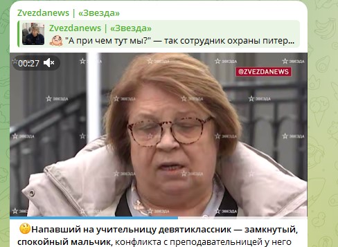 Директор питерской школы №191 Светлана Бабак рассказала о том, что напавший на учительницу девятиклассник — замкнутый, спокойный мальчик, конфликта с преподавательницей у него не было.