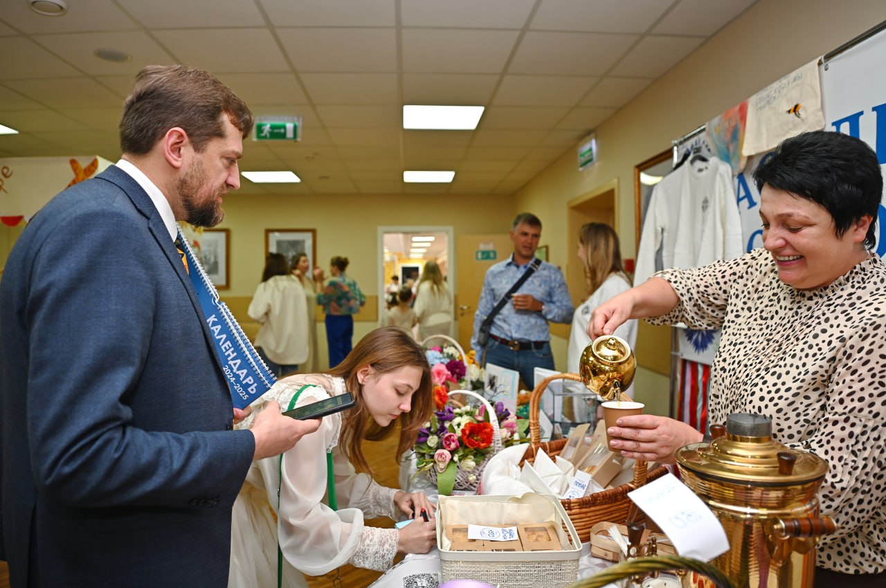 На ярмарке "Белый цветок" в Гимназии Святителя Василия Великого сегодня были представлены поделки учащихся и изделия декоративно-прикладного творчества. На мероприятии также присутствовал Константин Малофеев.