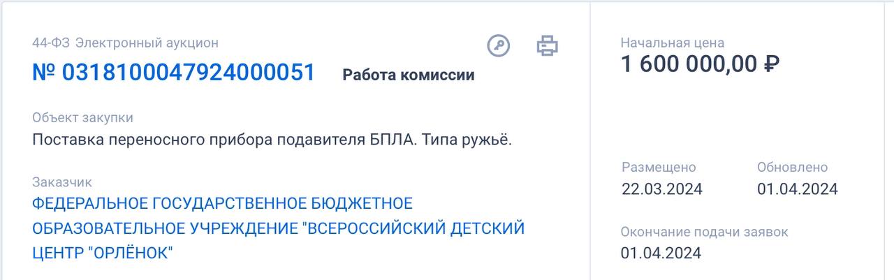 Ещё 22 марта ФГБОУ "Всероссийский детский центр «Орлёнок» " разместил на сайте госзакупок аукцион о поставке "переносного прибора подавителя БПЛА". Иными словами, руководство краснодарского детского лагеря хочет приобрести ружья, чтобы ликвидировать беспилотники.