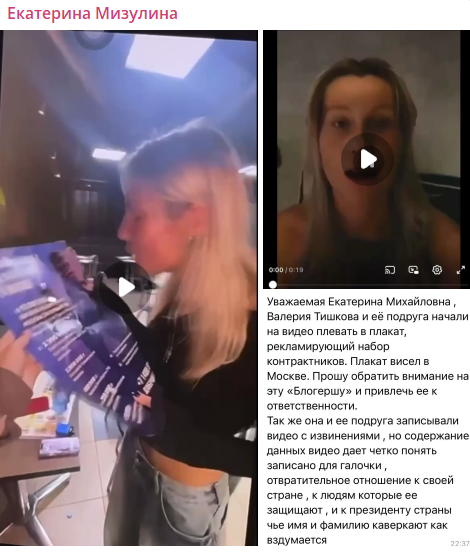Многие присылают эти видео. Некие блогерши плевались на плакат с призывом пойти на СВО по контракту, после чего записали видео с псевдоизвинениями, в которых откровенно глумятся. Направили инфо в правоохранительные органы,