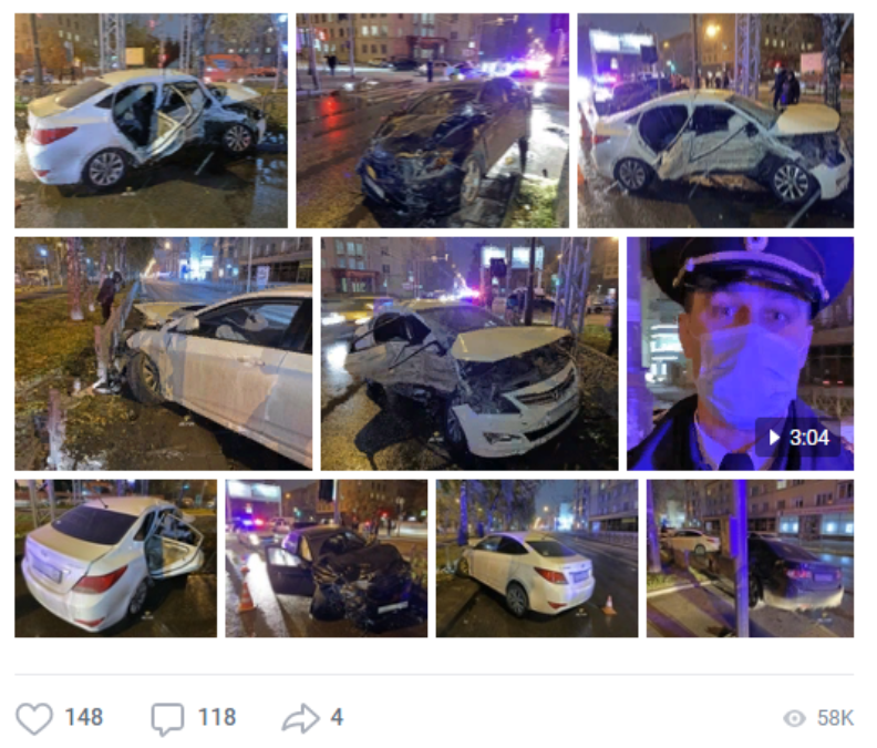 Поздним вечером 9 октября на перекрестке Красного проспекта и улицы Державина столкнулись автомобили Hyundai Solaris и Honda Accord. При столкновении Hyundai отлетел на металлический забор аллеи. Второй автомобиль откинуло в стоящий поблизости светофор.