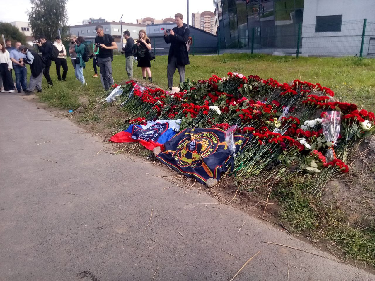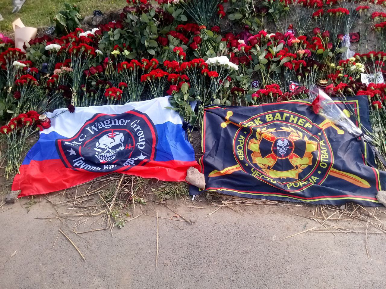 14:35. Так сейчас выглядит стихийный мемориал Евгению Пригожину напротив Вагнер-центра в Санкт-Петербурге.