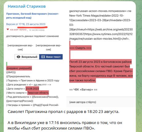 10:40. Писатель и публицист Николай Стариков обратил внимание на важную нестыковку в "Википедии": "Самолёт Пригожина пропал с радаров в 18:20 23 августа. А в "Википедии" уже в 17:16 вносились правки о том, что он якобы "был сбит российскими силами ПВО". Возникает вопрос. Может ли в таком крупном и известном, пускай и одиозном, проекте, как "Википедия", неправильно отображаться время?"