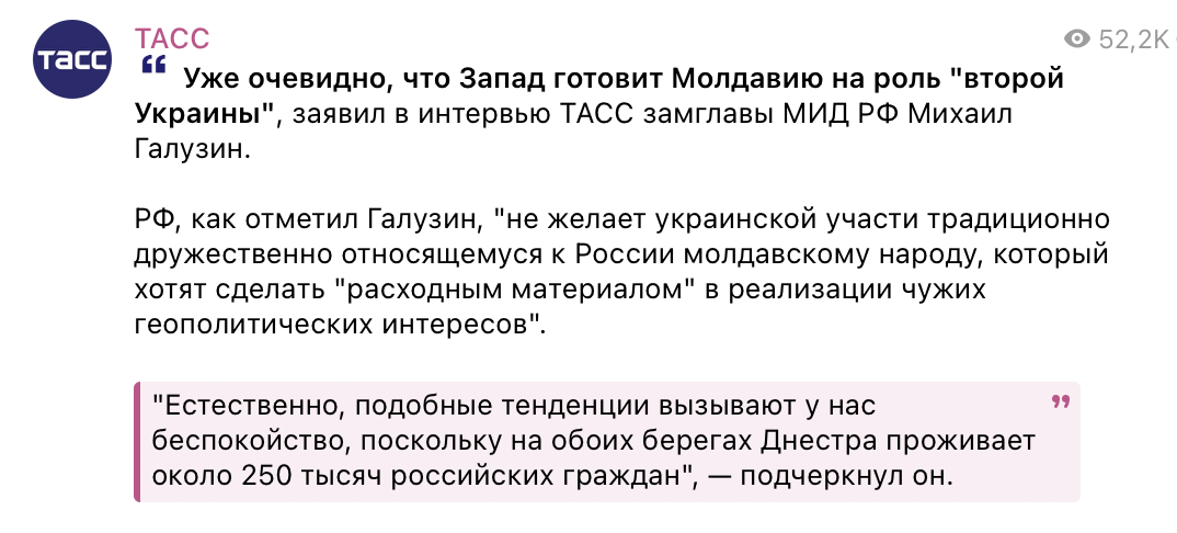 Россия обеспокоена планами Евросоюза по поводу Молдавии. В том числе - потому что там живут наши граждане. Фото: скриншот t.me/tass_agency