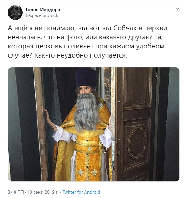 "А ещё я не понимаю: эта вот эта Собчак в церкви венчалась, что на фото, или какая-то другая? Та, которая церковь поливает при каждом удобном случае? Как-то неудобно получается", - иронизирует пользователь "Твиттера" Голос Мордора.