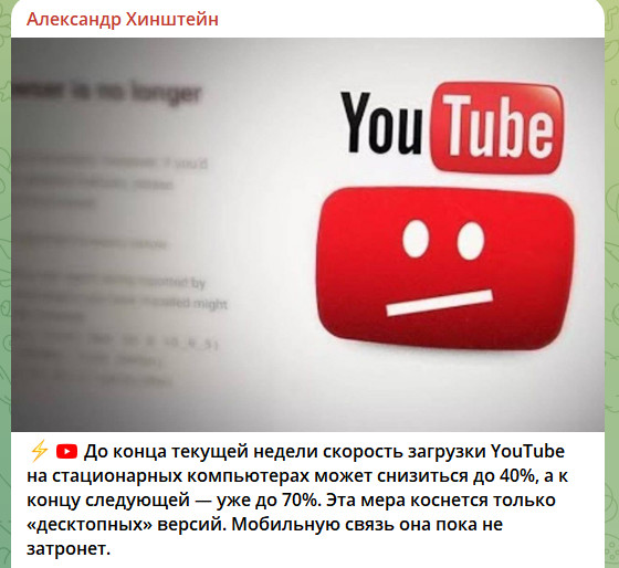 Глава Комитета Госдумы по информационной политике, информационным технологиям и связи Александр Хинштейн заявил, что до конца текущей недели скорость загрузки YouTube на стационарных персональных компьютерах в России может снизиться до 40%, а к концу следующей - уже до 70%.